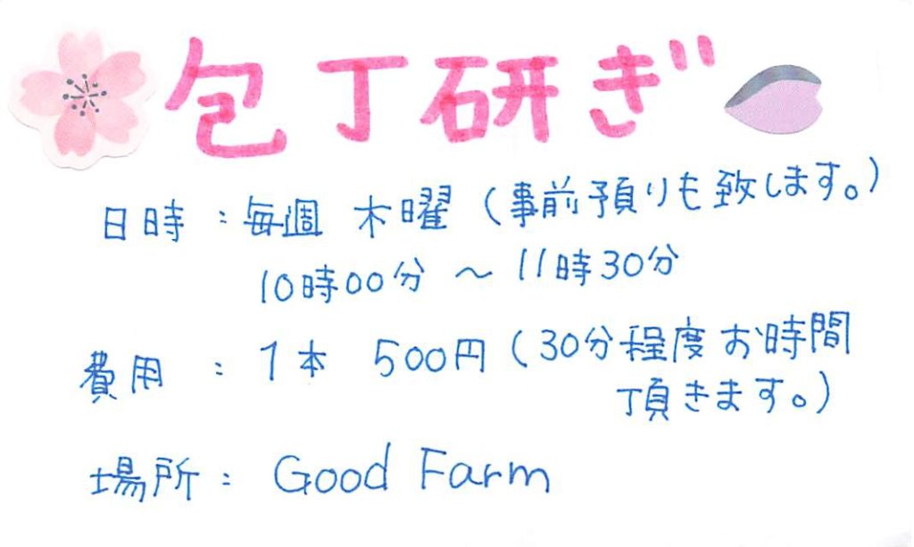 グッドファームでは、包丁研ぎを行っています。元料理人の長年の経験による磨き上げられた技術は、切れ味抜群で地域の方々から高い信頼で愛されています。 火曜日と木曜日の午前に作業を行っています。 【1本 500円】 ※お預かりは、平日8時30分~17時ま... -