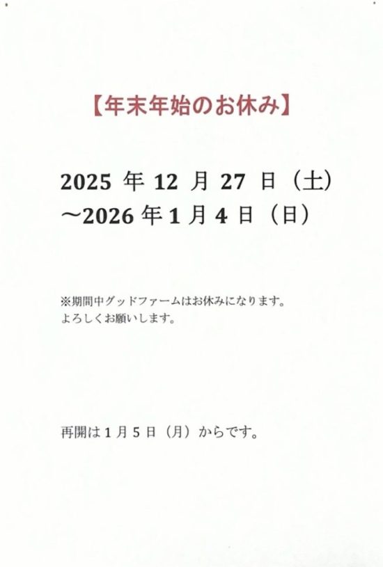 日頃よりグッドファームの活動に格別のご理解とご尽力賜り、心より御礼申し上げます。 誠に勝手ながら、弊社の年末年始休業を、下記のとおりとさせていただきます。 休業期間 2025年12月27日(土)~2026年1月4日(日) 期間中は大変ご不便をおかけいたし... -